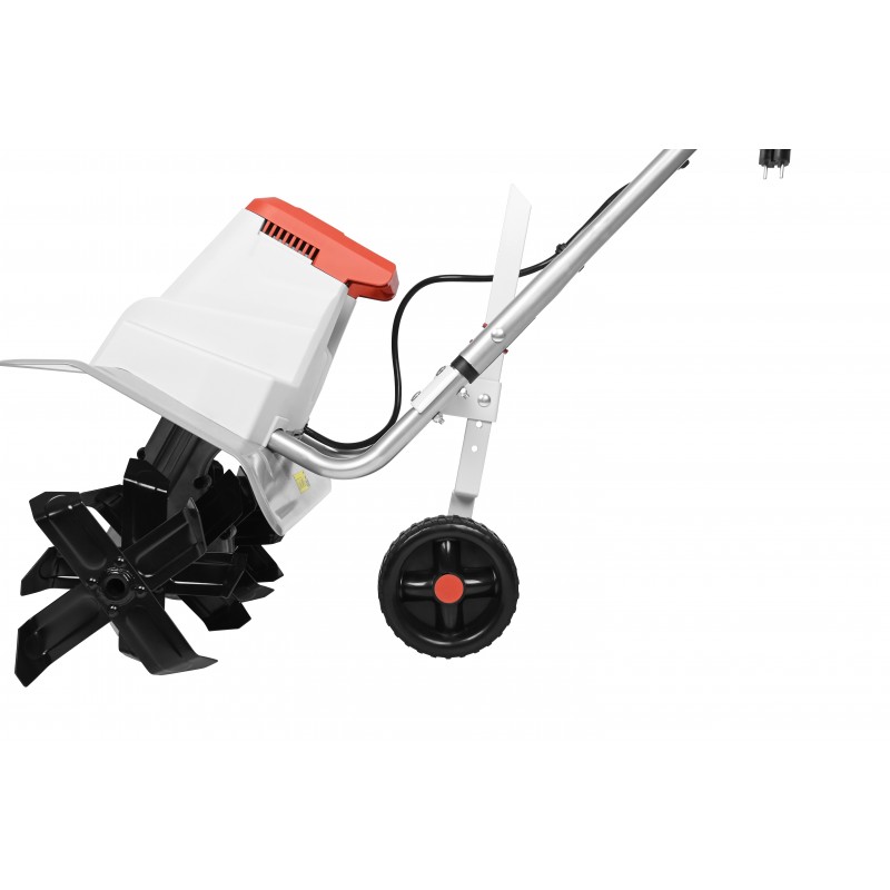Free Warranty: 24 mėn.IKRA IEM 1500 is a powerful electric garden tiller (cultivator) for loosening and preparing soil in beds and gardens. It offers two working widths (45 cm or 32 cm) thanks to detachable outer knives, making it suitable for both wider areas and narrower rows. The 1500 W motor and a robust, maintenance-free worm gear in an oil bath deliver reliable performance, while overload protection supports safe operation. Comfort and control come from the ergonomic softgrip handle, height-adjustable drag stake, transport wheel, cable strain relief and a safety switch with switch-on lock. An electrical safety brake adds extra control.