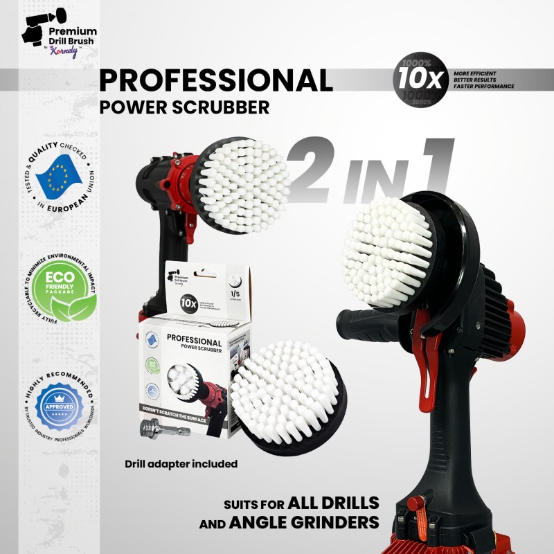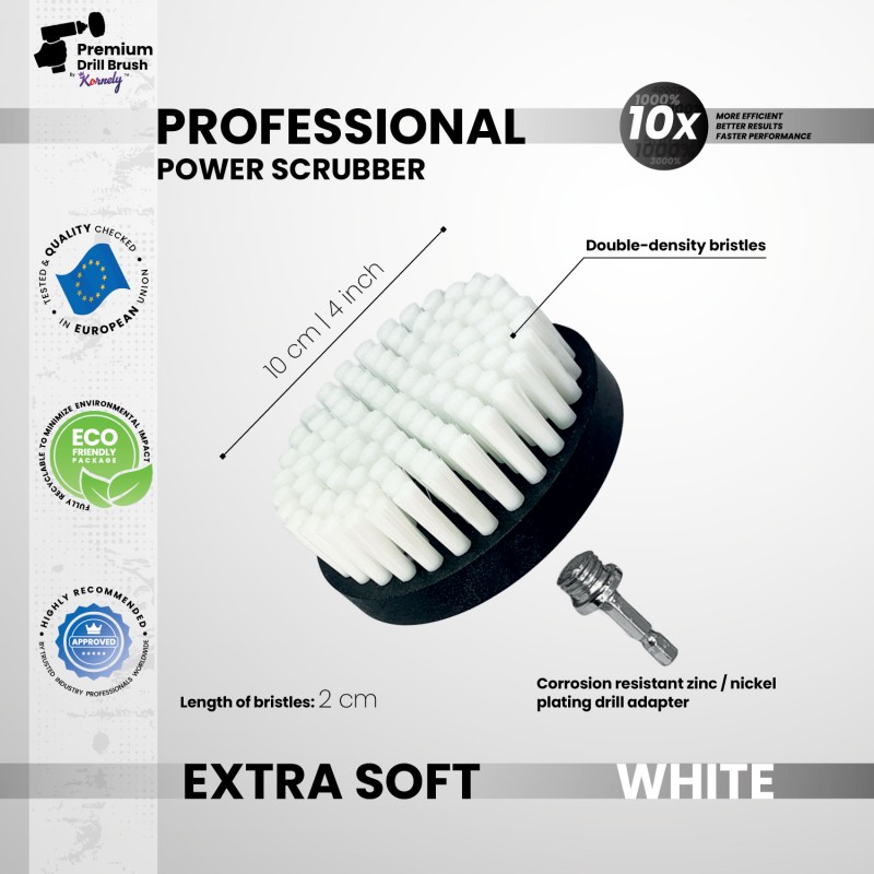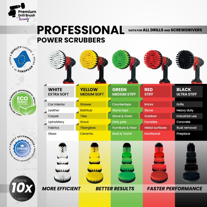 Premium klasės profesionalūs Drill Brush by Kornely valymo šepečiai yra specialiai sukurti atlikti įvairius valymo darbus greitai ir nepriekaištingai. Premium kokybės šepečiai suktuvams-gręžtuvams yra puikiai tinkami tiek vidaus, tiek lauko valymo darbams atlikti, taip pat pramoniniam valymui. Šepečiai nebraižo paviršiaus ir nepažeidžia dažų.