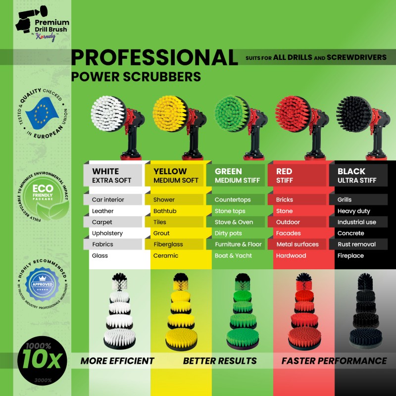 Premium klasės profesionalūs Drill Brush by Kornely valymo šepečiai yra specialiai sukurti atlikti įvairius valymo darbus greitai ir nepriekaištingai. Premium kokybės šepečiai suktuvams-gręžtuvams yra puikiai tinkami tiek vidaus, tiek lauko valymo darbams atlikti, taip pat pramoniniam valymui. Šepečiai nebraižo paviršiaus ir nepažeidžia dažų.